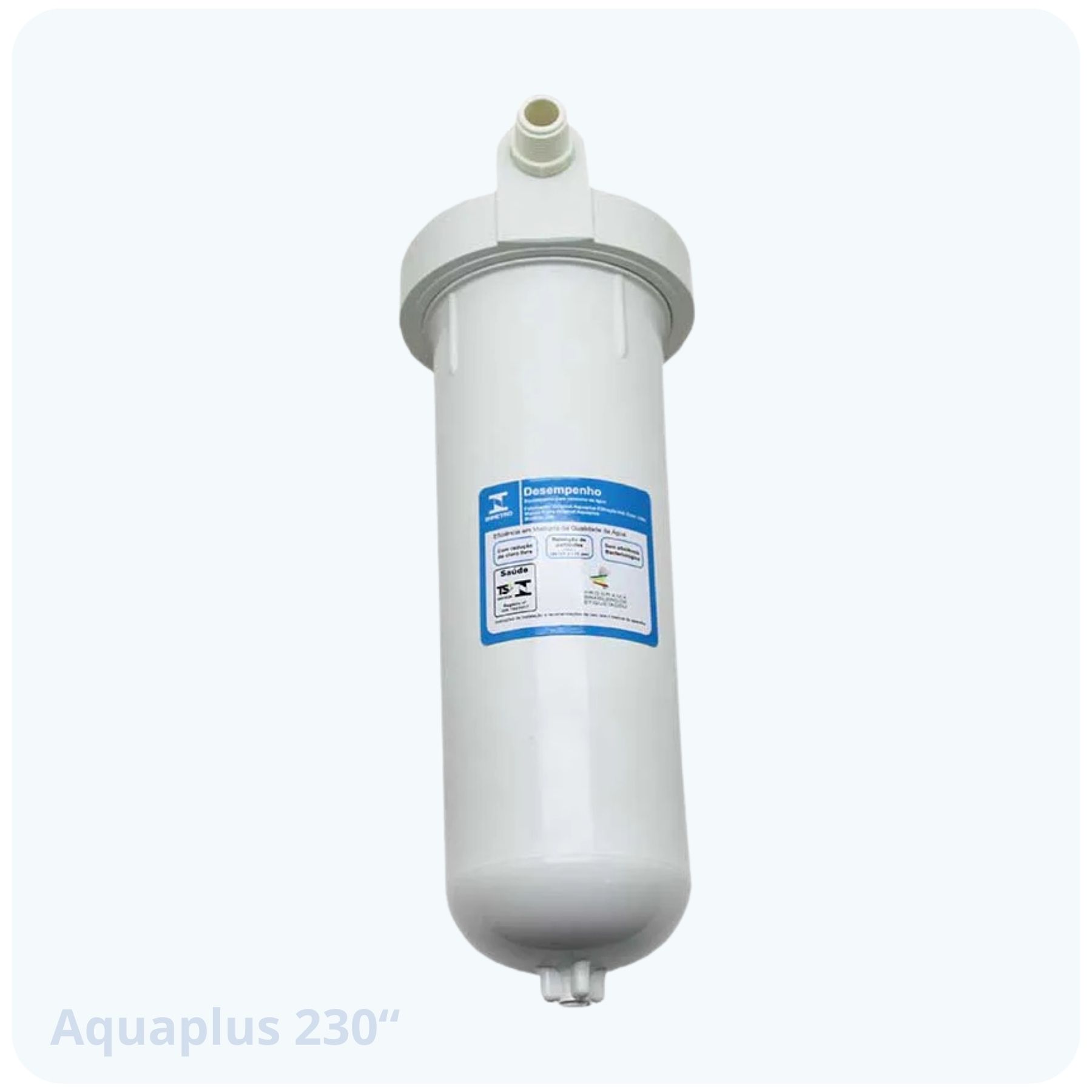 Filtro Aquaplus 230 BR com vazão de 90-420 L/h e operação entre 40 KPa e 400 KPa. Filtração de 5 micra (Classe C (5-15 µm)). Redução de cloro.